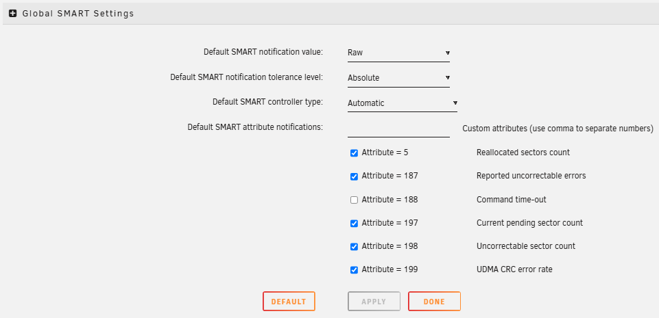 You can modify additional settings for your disk devices on this page. Enable your array to start automatically on boot, adjust disk spin-down timers, and even change advanced driver settings like SMART polling frequency.